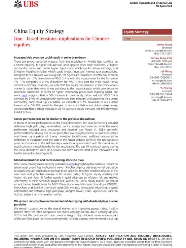 【UBS Securities Asia Limited】【20240418】UBS Equities-China Equity Strategy Iran - Israel tensions implications-16页 行业研究