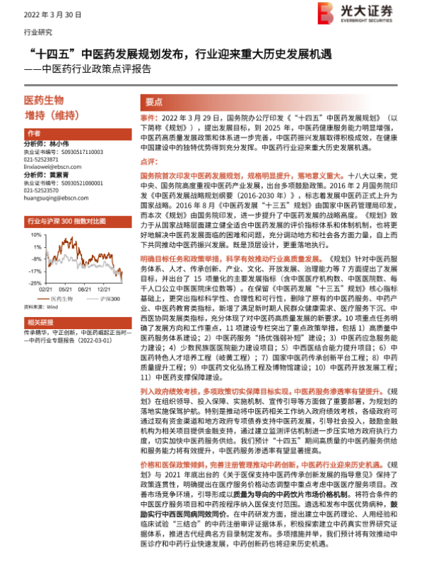 【光大证券】【20220330】“十四五”中医药发展规划发布,行业迎来重大历史发展机遇-4页 行业研究
