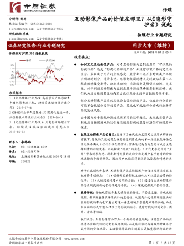 【中原证券】【20190705】传媒行业专题研究:互动影像产品的价值在哪里?从《隐形守护者》说起-13页 行业研究