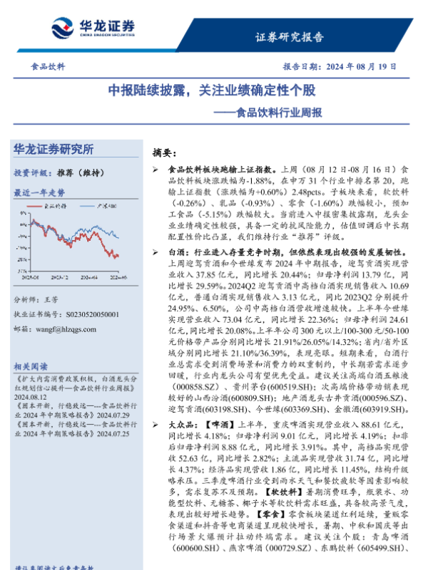 【华龙证券】【20240819】食品饮料行业周报:中报陆续披露,关注业绩确定性个股-12页 行业研究