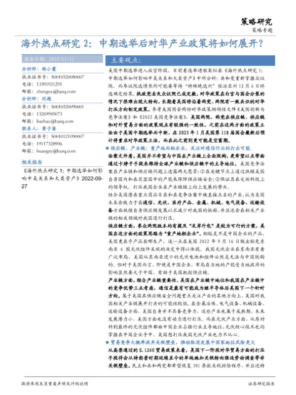 【华安证券】【20221111】海外热点研究2:中期选举后对华产业政策将如何展开?-20页 行业研究