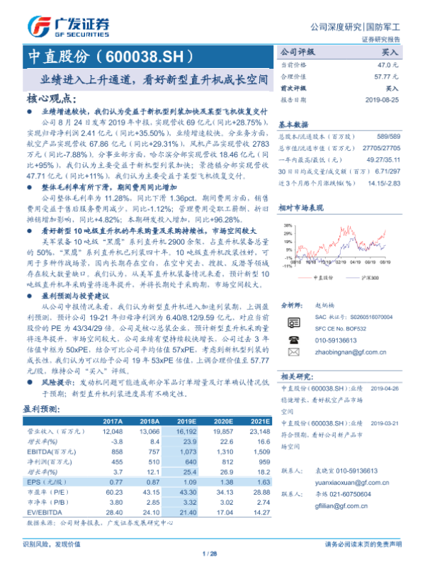 【广发证券】【20190825】中直股份(600038.SH)业绩进入上升通道,看好新型直升机成长空间-28页 行业研究