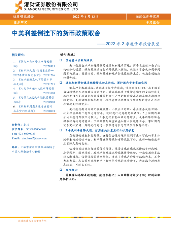 【湘财证券】【20220413】2022年2季度债市投资展望:中美利差倒挂下的货币政策取舍-21页 行业研究