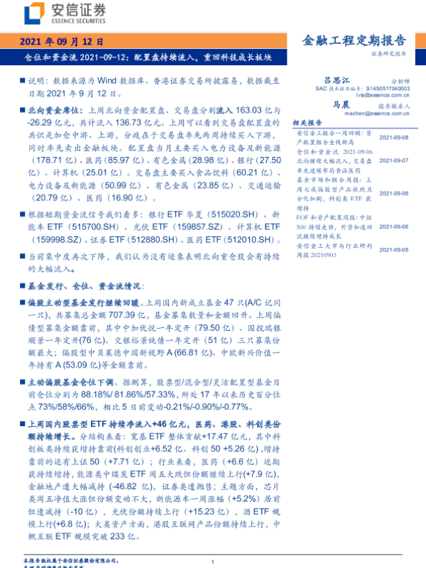 【安信证券】【20210912】金融工程定期报告:仓位和资金流,配置盘持续流入,重回科技成长板块-21页 行业研究