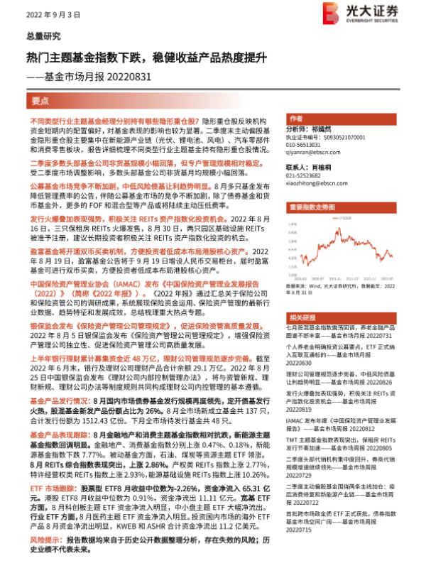 【光大证券】【20220903】基金市场月报:热门主题基金指数下跌,稳健收益产品热度提升-25页 行业研究