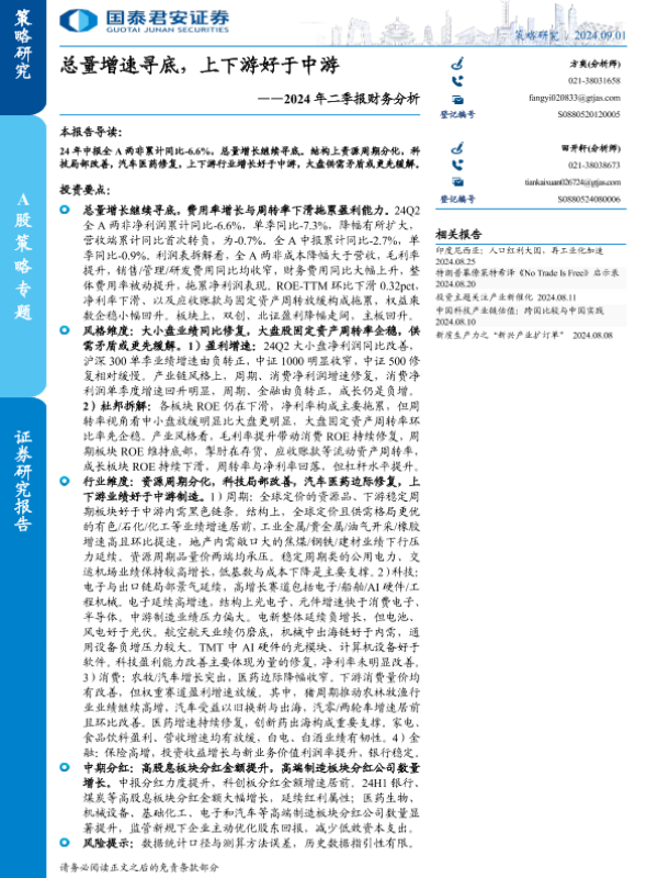 【国泰君安证券】【20240901】2024年二季报财务分析:总量增速寻底,上下游好于中游-22页 行业研究