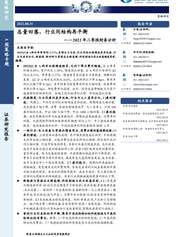 【国泰君安证券】【20220831】2022年二季报财务分析:总量回落,行业间结构再平衡-21页 行业研究