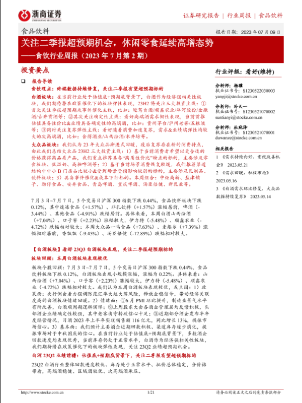 【浙商证券】【20230709】食饮行业周报(2023年7月第2期):关注二季报超预期机会,休闲零食延续高增态势-21页 行业研究