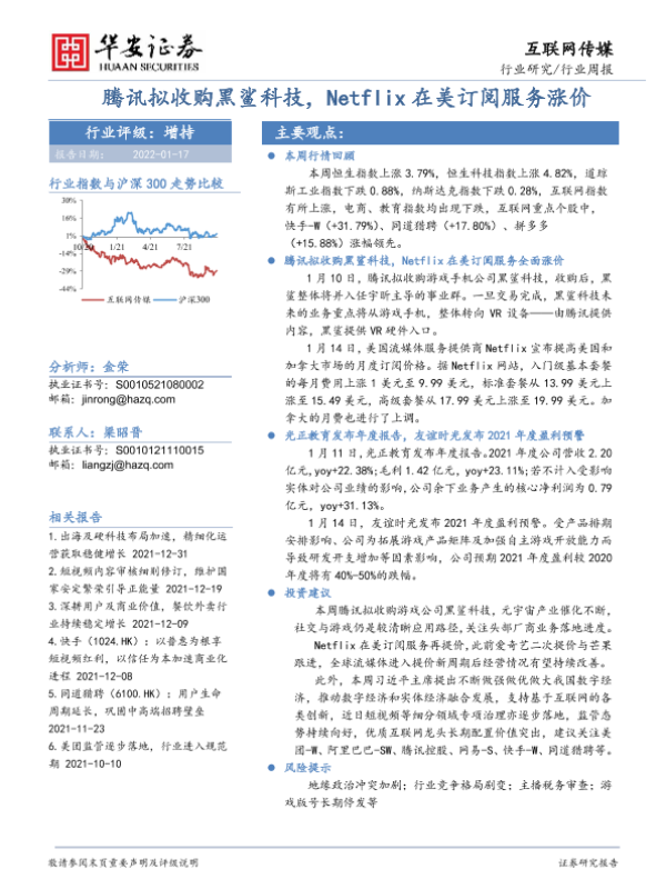 【华安证券】【20220117】20220117-华安证券-互联网传媒行业周报:腾讯拟收购黑鲨科技,Netflix在美订阅服务涨价-19页 行业研究