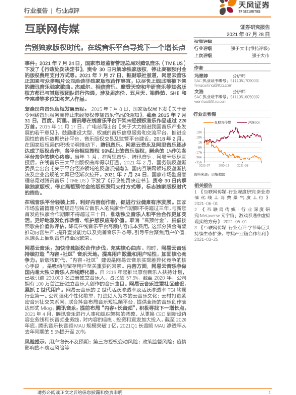 【天风证券】【20210728】互联网传媒行业点评:告别独家版权时代,在线音乐平台寻找下一个增长点-2页 行业研究
