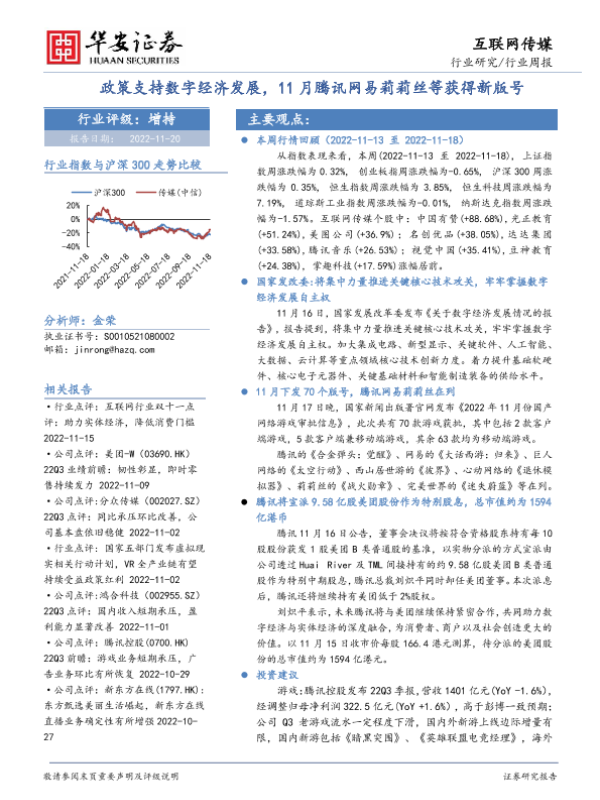 【华安证券】【20221120】互联网传媒行业周报:政策支持数字经济发展,11月腾讯网易莉莉丝等获得新版号-27页 行业研究