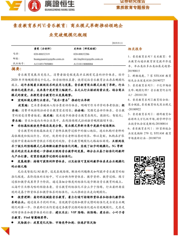 【广证恒生】【20190911】素质教育系列Ⅵ音乐教育:商业模式革新推动领跑企业突破规模化瓶颈-28页 行业研究