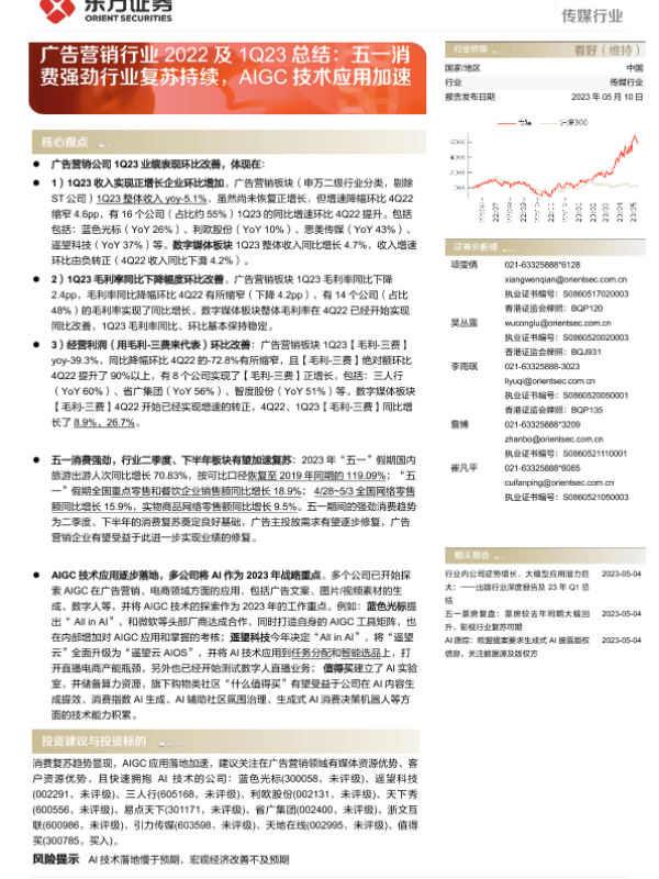 【东方证券】【20230510】广告营销行业2022及1Q23总结:五一消费强劲行业复苏持续,AIGC技术应用加速-15页 行业研究