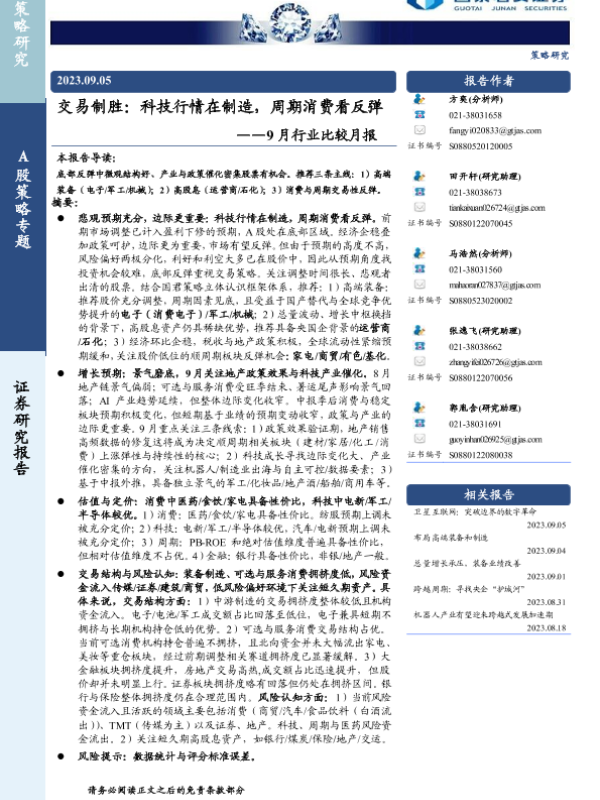 【国泰君安证券】【20230905】9月行业比较月报:交易制胜,科技行情在制造,周期消费看反弹-30页 行业研究