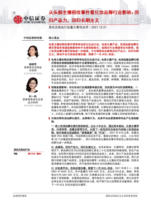 【中信证券】【20211221】美妆及商业行业重大事项点评:从头部主播税收事件看化妆品等行业影响-3页 证券期货研究报告