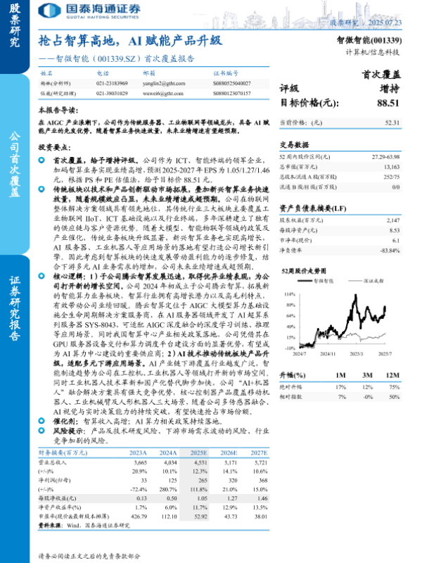 【国泰海通证券】【20250723】智微智能(001339)首次覆盖报告:抢占智算高地,AI赋能产品升级-27页 证券期货研究报告