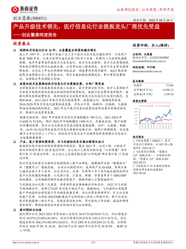 【浙商证券】【20230424】创业慧康深度报告:产品升级技术领先,医疗信息化行业提振龙头厂商优先受益-25页 行业研究