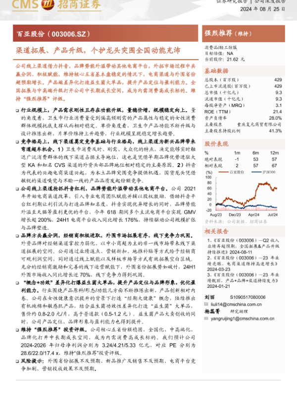 【海通证券】【20240825】百亚股份(003006)渠道拓展、产品升级,个护龙头突围全国动能充沛-20页 行业研究
