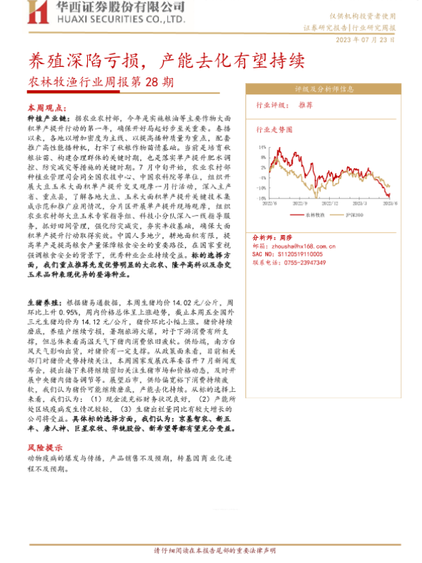 【华西证券】【20230723】农林牧渔行业周报第28期:养殖深陷亏损,产能去化有望持续-25页 行业研究