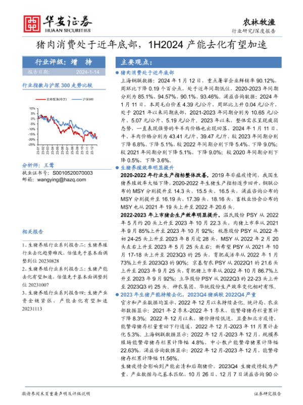 【华安证券】【20240114】猪肉消费处于近年底部,1H2024产能去化有望加速-18页 行业研究