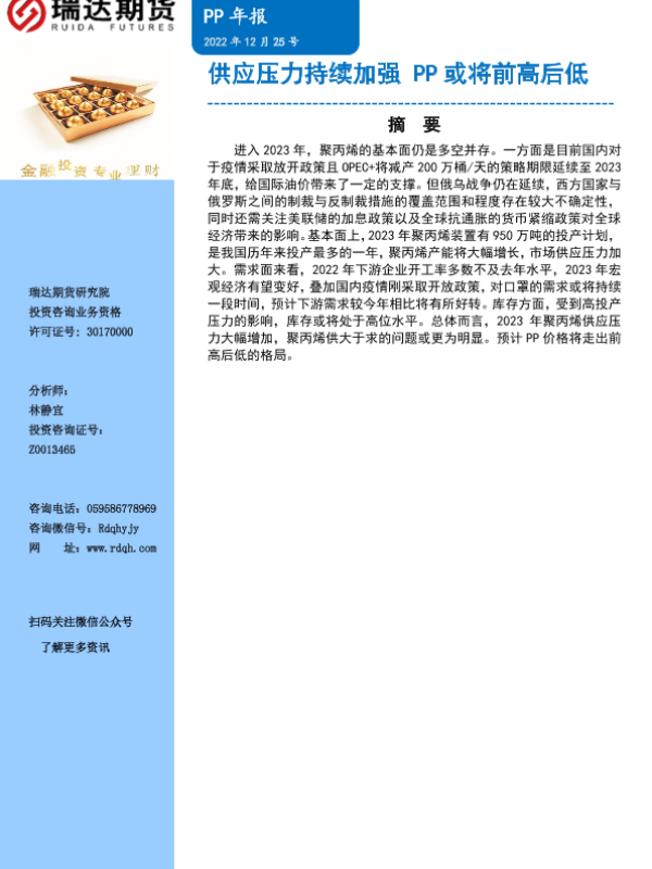【瑞达期货】【20221225】PP年报:供应压力持续加强,PP或将前高后低-17页 行业研究