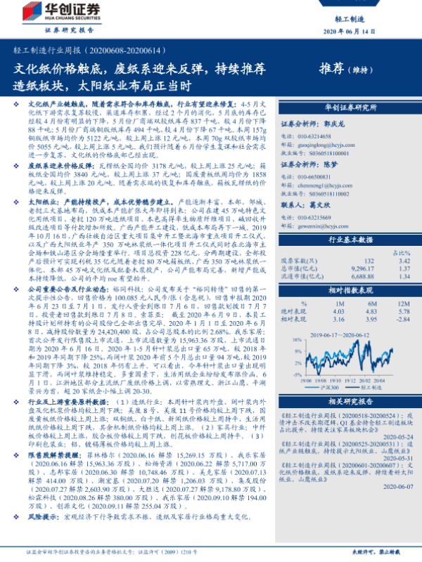 【华创证券】【20200614】轻工制造行业周报:文化纸价格触底,废纸系迎来反弹,持续推荐造纸板块,太阳纸业布局正当时-15页 行业研究