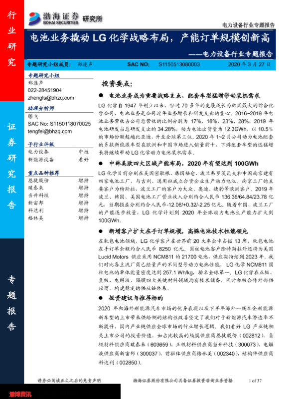 【渤海证券】【20200327】电力设备行业专题报告:电池业务撬动LG化学战略布局,产能订单规模创新高-37页 行业研究
