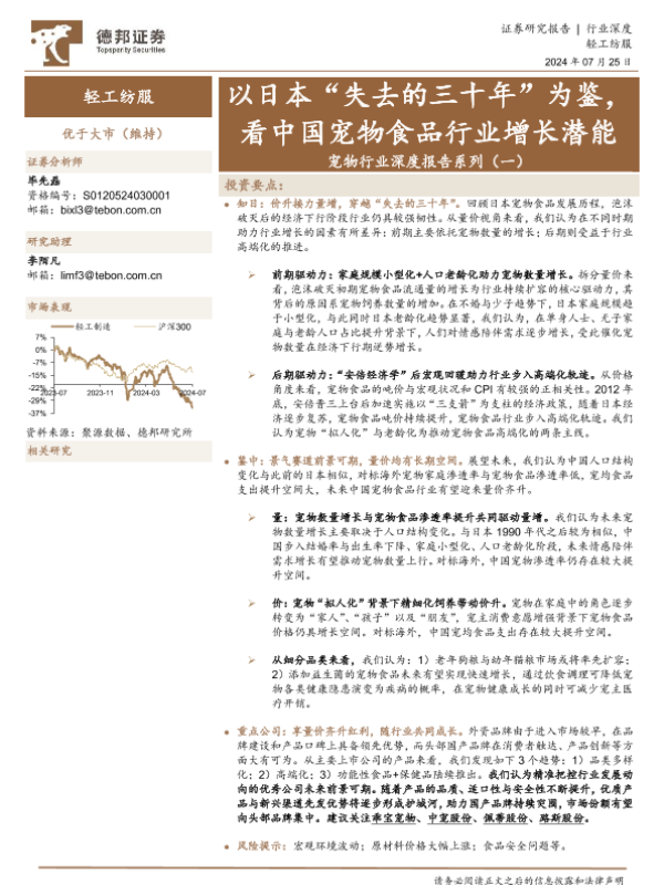 【德邦证券】【20240725】宠物行业深度报告系列(一):以日本“失去的三十年”为鉴,看中国宠物食品行业增长潜能-20页 行业研究