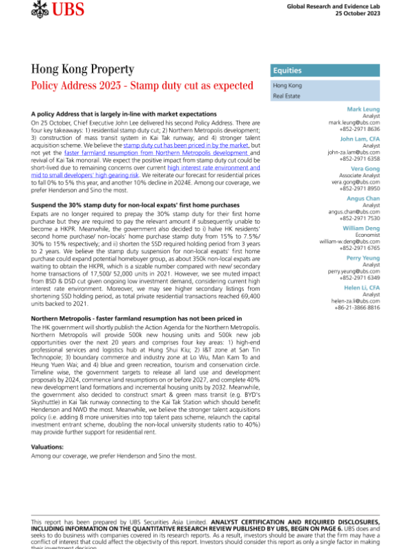 【UBS Securities Asia Limited】【20231025】香港房地产政策2023 - 印花税削减及其他政策措施-15页 行业研究