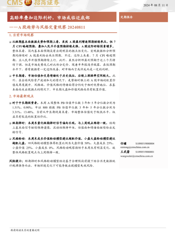 【海通证券】【20240811】A股趋势与风格定量观察:高赔率叠加边际利好,市场或临近底部-10页 行业研究