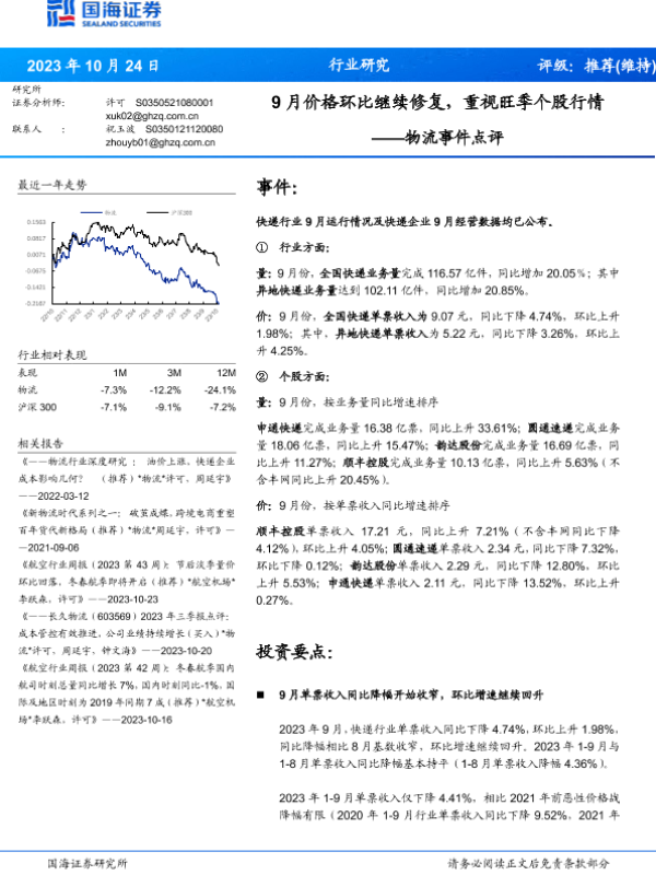 【国海证券】【20231024】物流行业事件点评:9月价格环比继续修复,重视旺季个股行情-15页 行业研究
