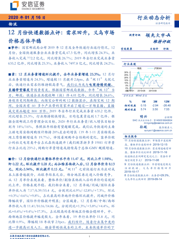 【安信证券】【20200116】12月份快递数据点评:需求回升,义乌市场价格总体平稳-10页 行业研究