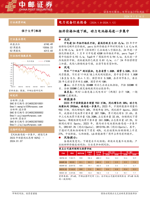 【中邮证券】【20240114】电力设备行业报告:组件价格加速下跌,动力电池格局进一步集中-18页 行业研究
