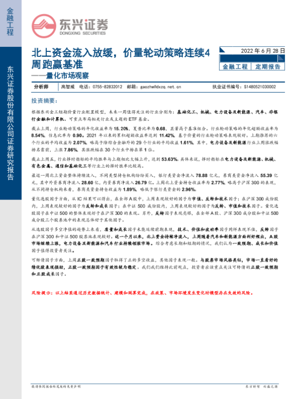 【东兴证券】【20220628】量化市场观察:北上资金流入放缓,价量轮动策略连续4周跑赢基准-20页 行业研究