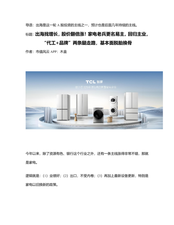 【市值风云 APP】【20240612】出海找增长,股价翻倍涨!家电老兵更名易主,回归主业,“代工+品牌”两条腿走路,基本面脱胎换骨-16页 行业研究