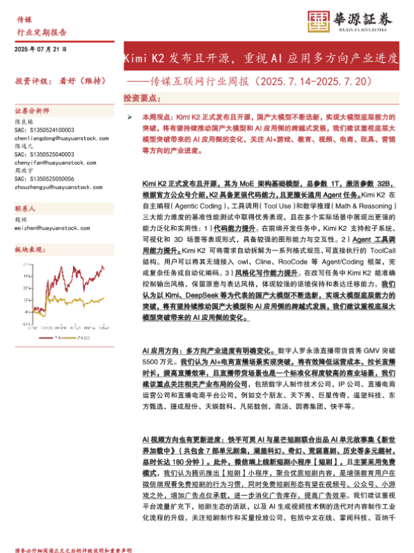 【华源证券】【20250721】传媒互联网行业周报:Kimi K2发布且开源,重视AI应用多方向产业进度-18页 证券期货研究报告