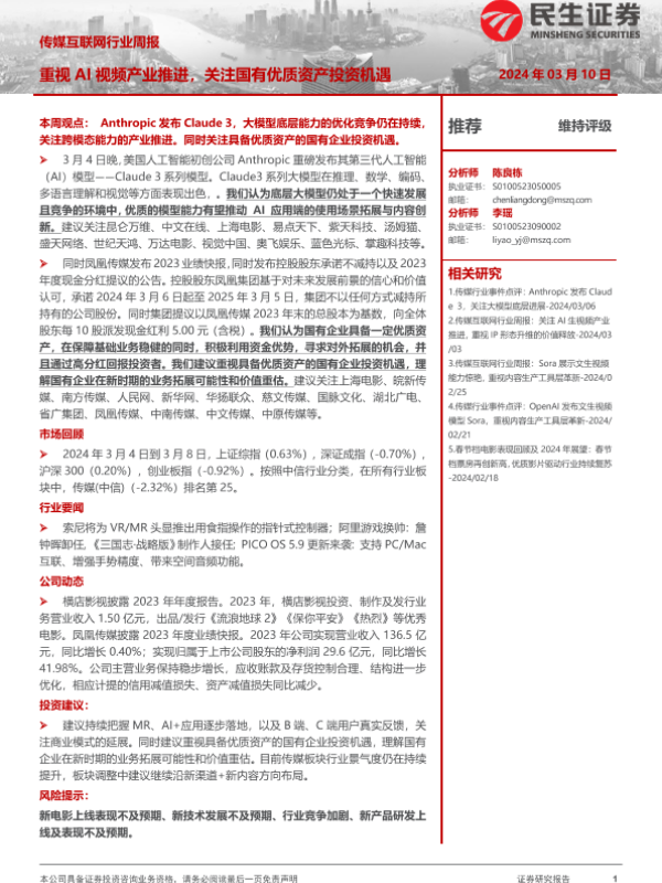 【民生证券】【20240310】传媒互联网行业周报:重视AI视频产业推进,关注国有优质资产投资机遇-16页 行业研究