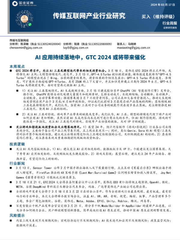 【国金证券】【20240317】传媒互联网产业行业周报:AI应用持续落地中,GTC 2024或将带来催化-15页 行业研究