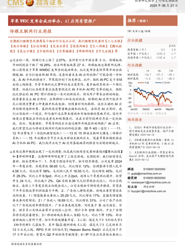 【海通证券】【20240621】传媒互联网行业周报:苹果WWDC发布会成功举办,AI应用有望推广-12页 行业研究