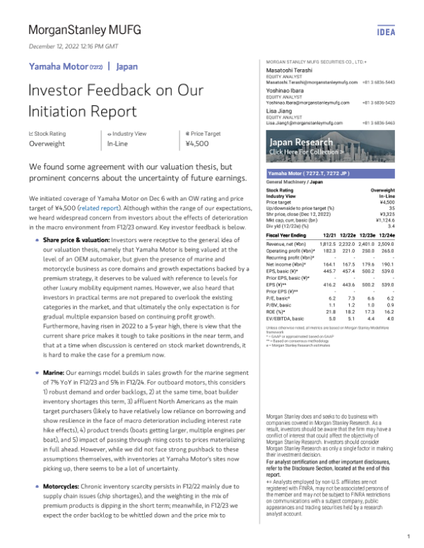 【Morgan Stanley】【20221206】Morgan Stanley-Yamaha Motor Investor Feedback on Our Initiation Report-8页 行业研究