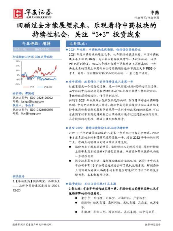 【华安证券】【20220103】中药行业专题:回顾过去方能展望未来,乐观看待中药板块的持续性机会,关注“3+3”投资线索-21页 行业研究