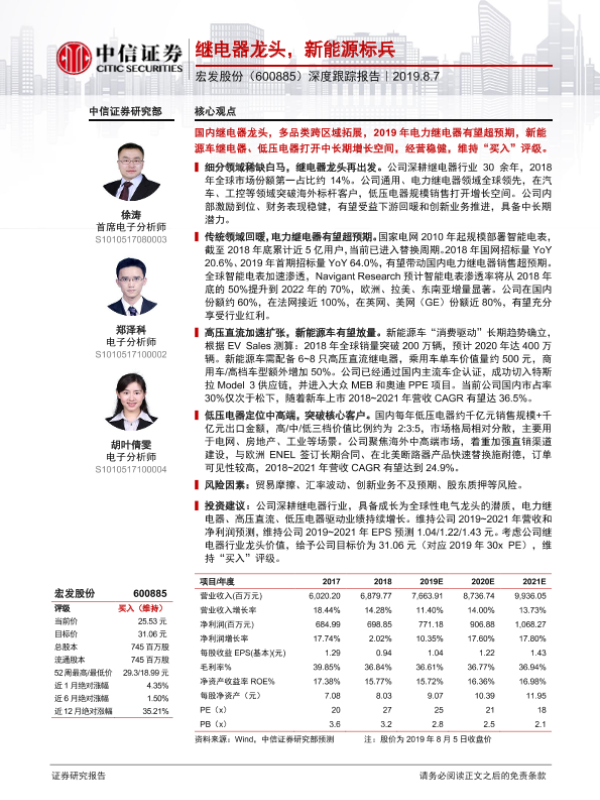 【中信证券】【20190807】20190807-中信证券-宏发股份-600885.SH-深度跟踪报告:继电器龙头,新能源标兵-20页 行业研究
