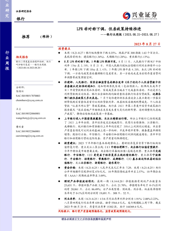 【兴业证券】【20230827】LPR非对称下调,住房政策持续推进-16页 行业研究