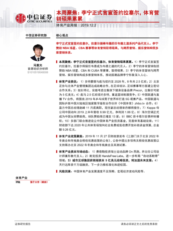 【中信证券】【20191202】20191202-中信证券-体育产业周报:本周聚焦:李宁正式官宣签约拉塞尔,体育营销硕果累累-19页 行业研究