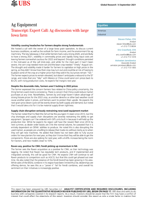 【瑞银】【20210906】瑞银-美股农业设备行业-会议记录:专家电话:与爱荷华州大型农场的农业讨论-24页 行业研究