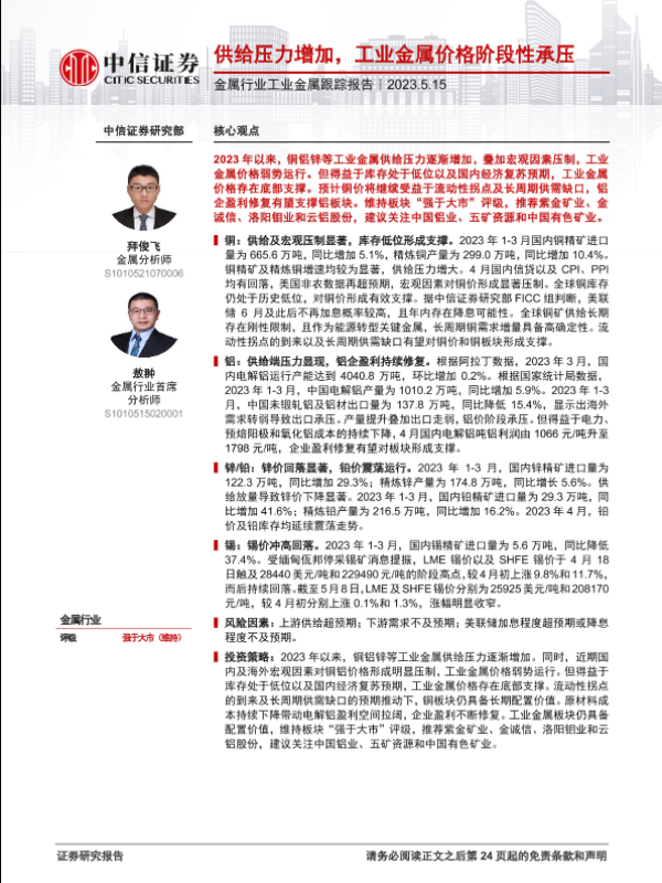 【中信证券】【20230515】金属行业工业金属跟踪报告:供给压力增加,工业金属价格阶段性承压-25页 行业研究