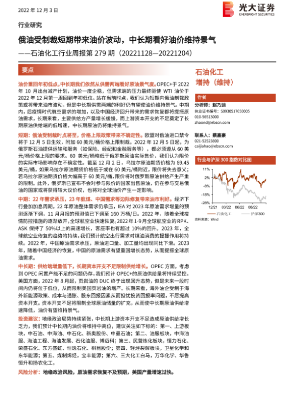 【光大证券】【20221203】20221203-光大证券-石油化工行业周报第279期:俄油受制裁短期带来油价波动,中长期看好油价维持景气-20页 行业研究