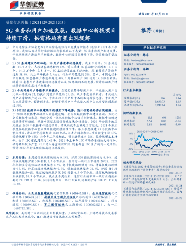 【华创证券】【20211205】通信行业周报:5G业务和用户加速发展,数据中心新报项目持续下滑,供需格局有望出现缓解-18页 行业研究