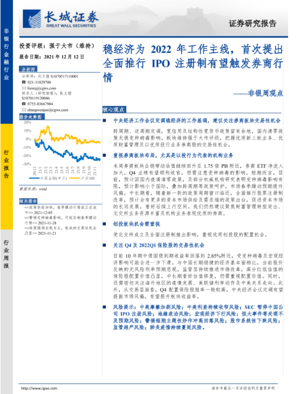【长城证券】【20211212】非银周观点:稳经济为2022年工作主线,首次提出全面推行IPO注册制有望触发券商行情-33页 行业研究