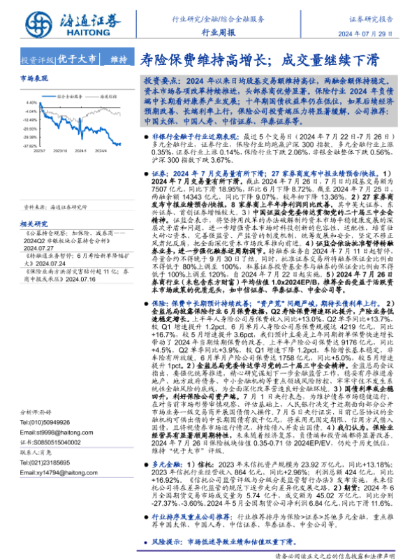 【海通证券】【20240729】综合金融服务行业周报:寿险保费维持高增长;成交量继续下滑-12页 行业研究